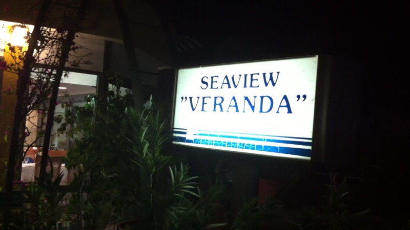 ロンビーチホテルの中庭の看板。ベランダ⁇日本語?