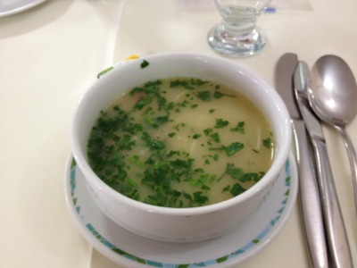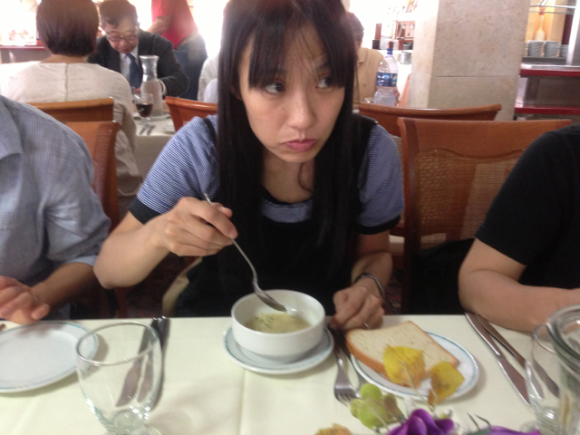 スープ飲んでます。 パンは、給食のパンみたい。 (^_^)