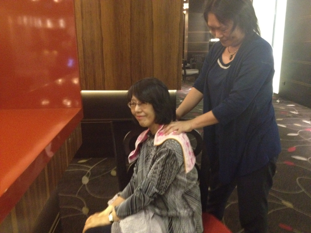 渕野牧師の肩をもんであげている土屋さん。