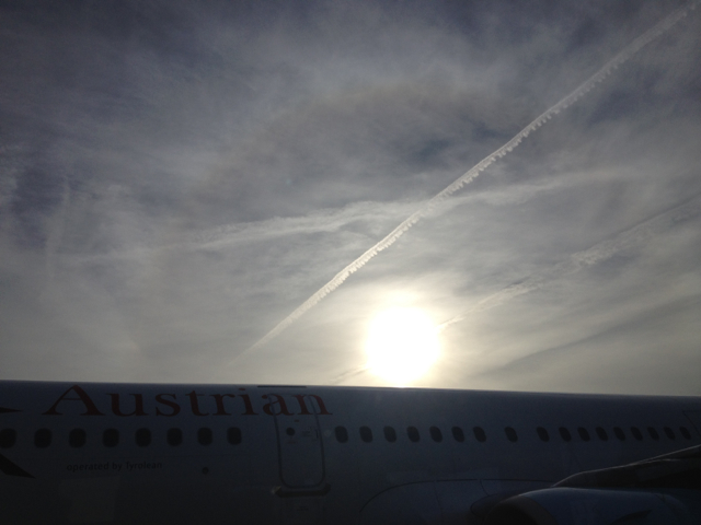 チームが到着したウィーンの空に光輪が出ました。手前はチームが乗っていた飛行機です。