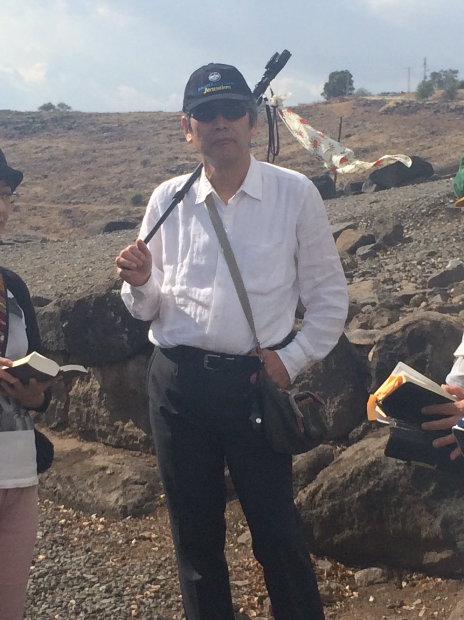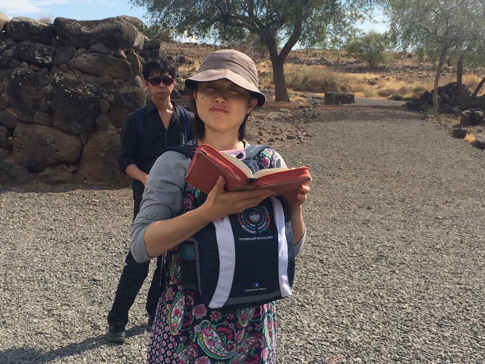 コラジンにて、リュックを前に聖書を開く山中さん!
