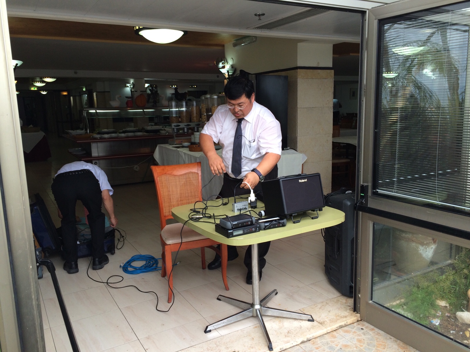 いったん礼拝のセッティングを室内でします。しかし、礼拝ギリギリまで雨の様子を見て可能なら最小機材をもって外に移動します。お祈りください。