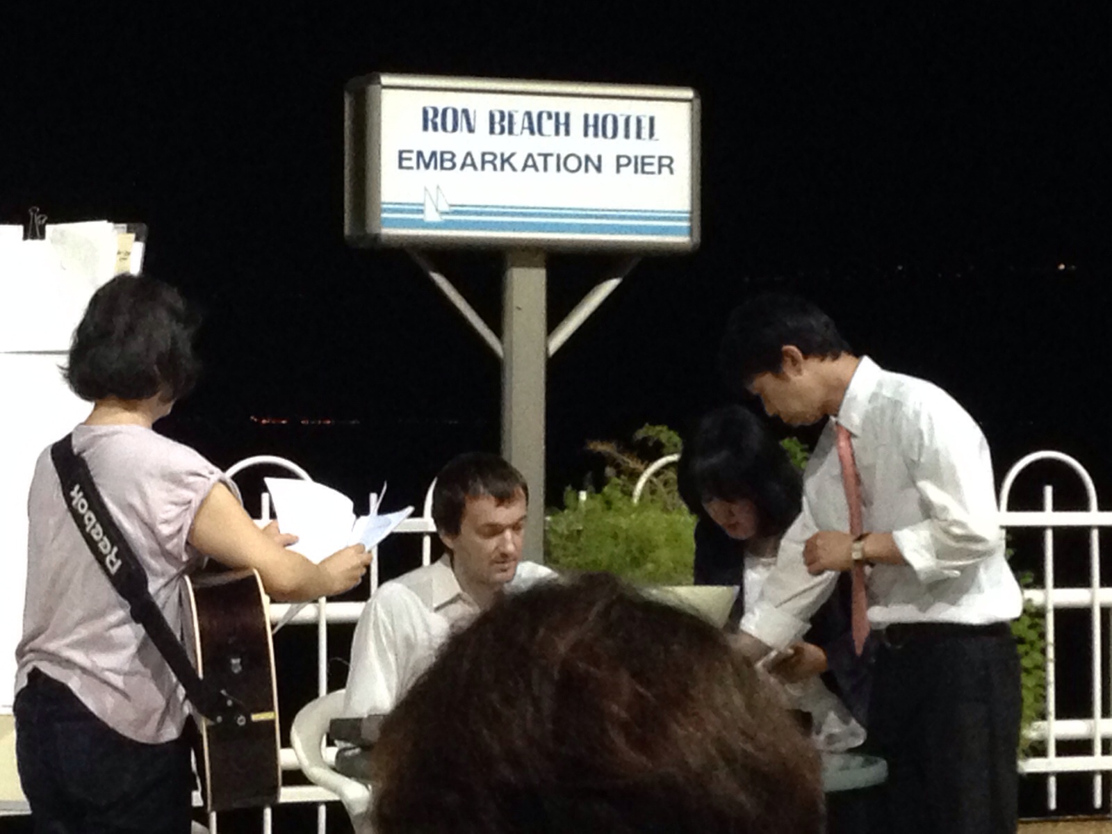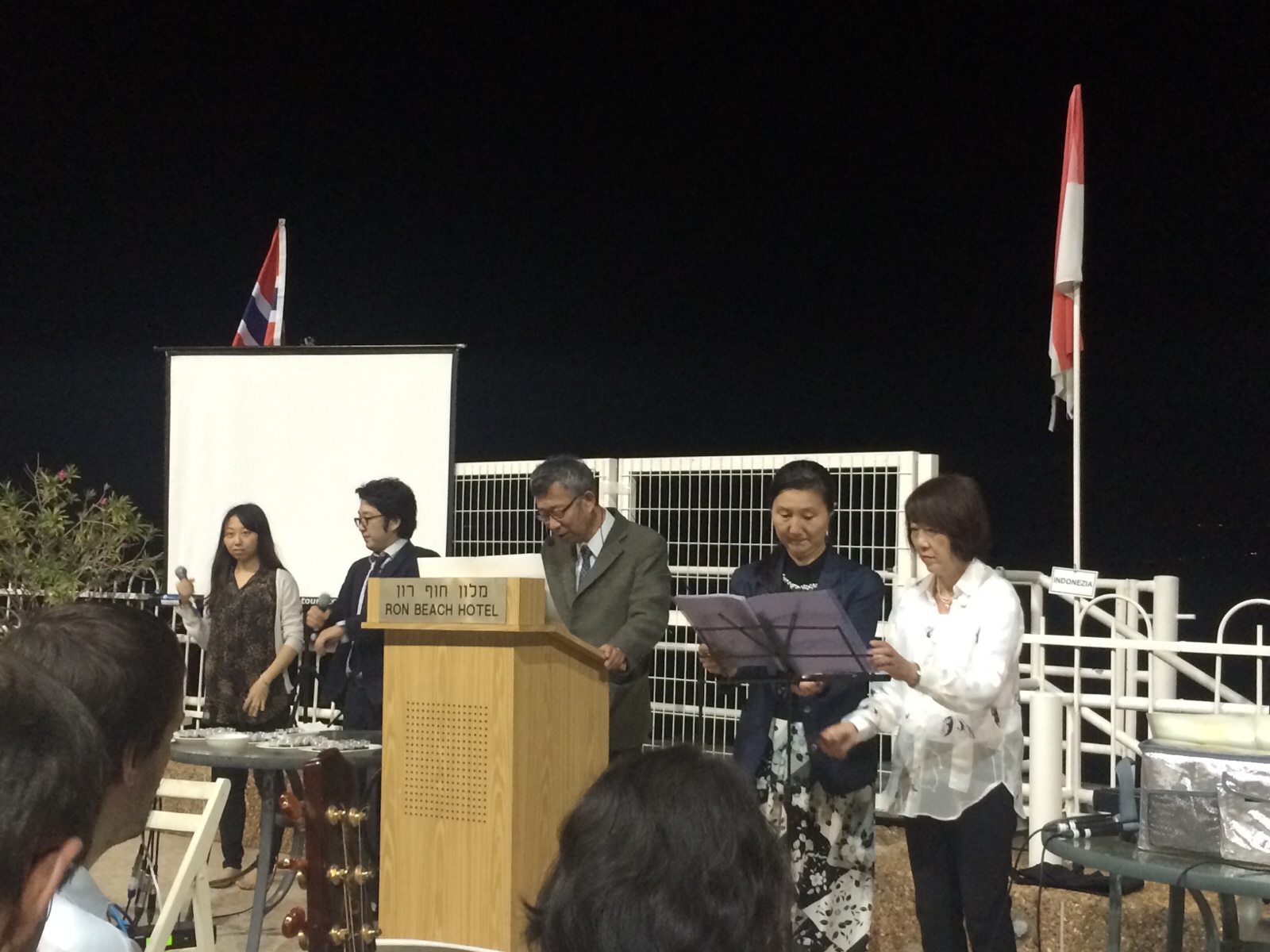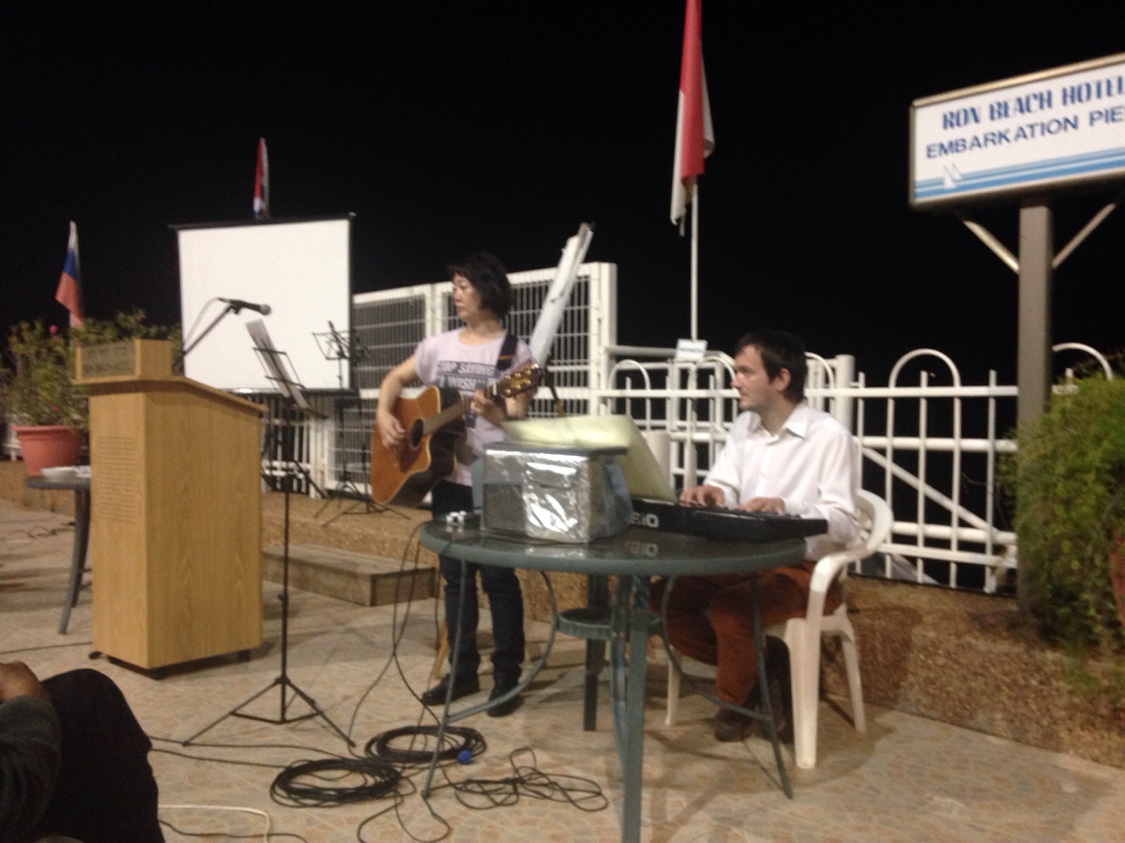 夜のガリラヤ湖をバックに決めポーズ(^^)v
