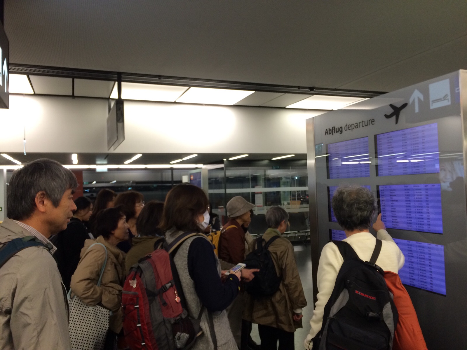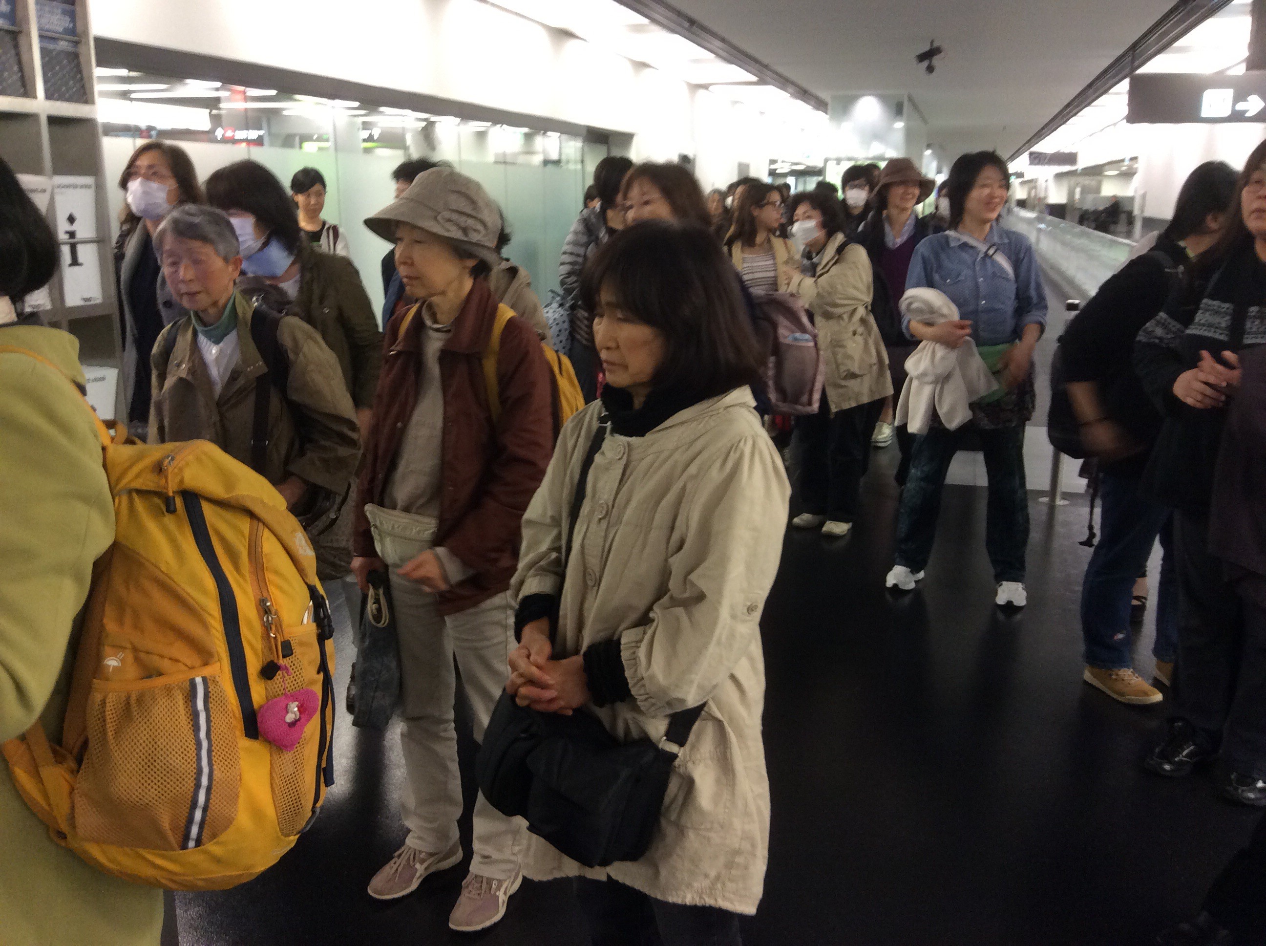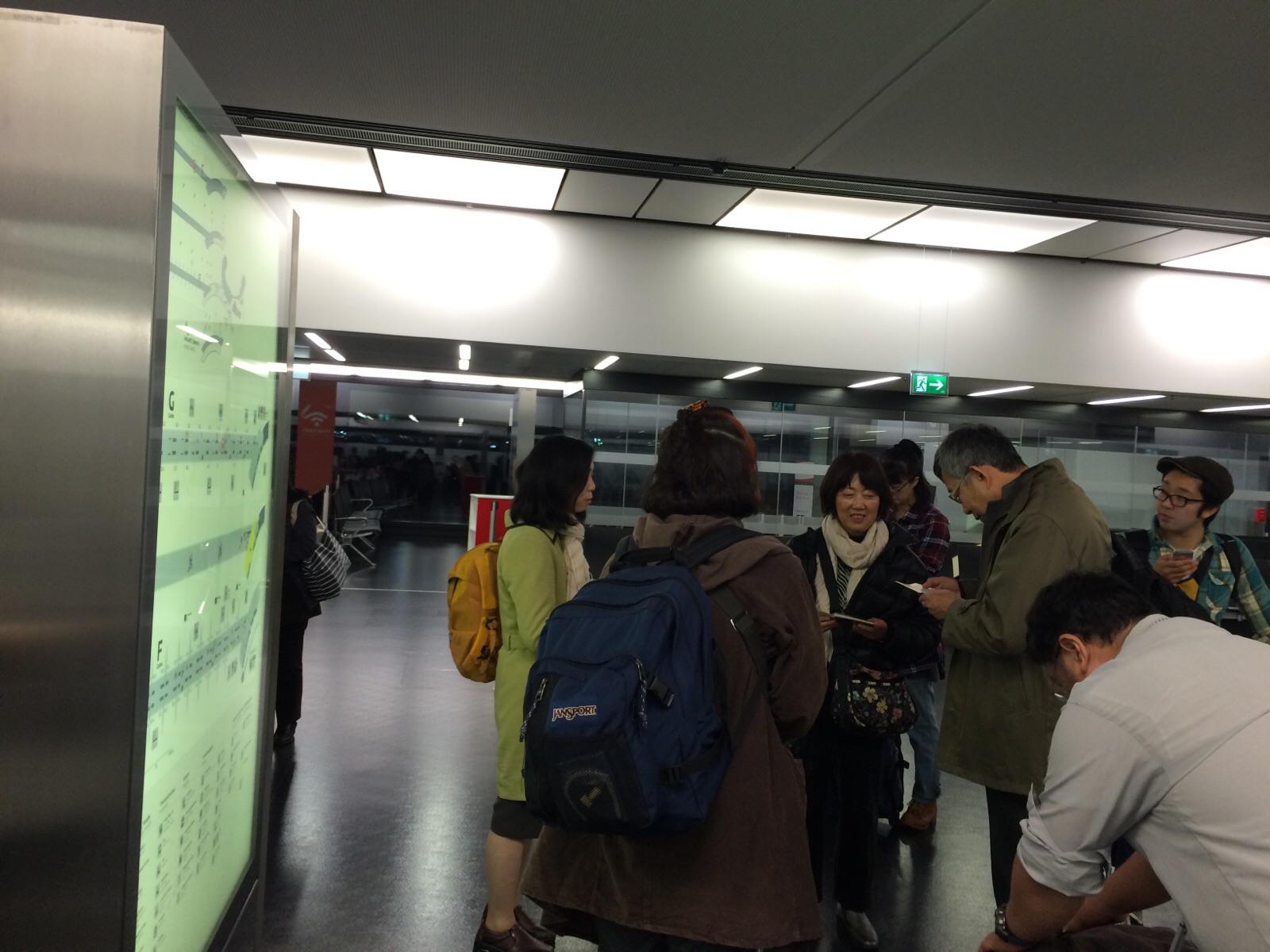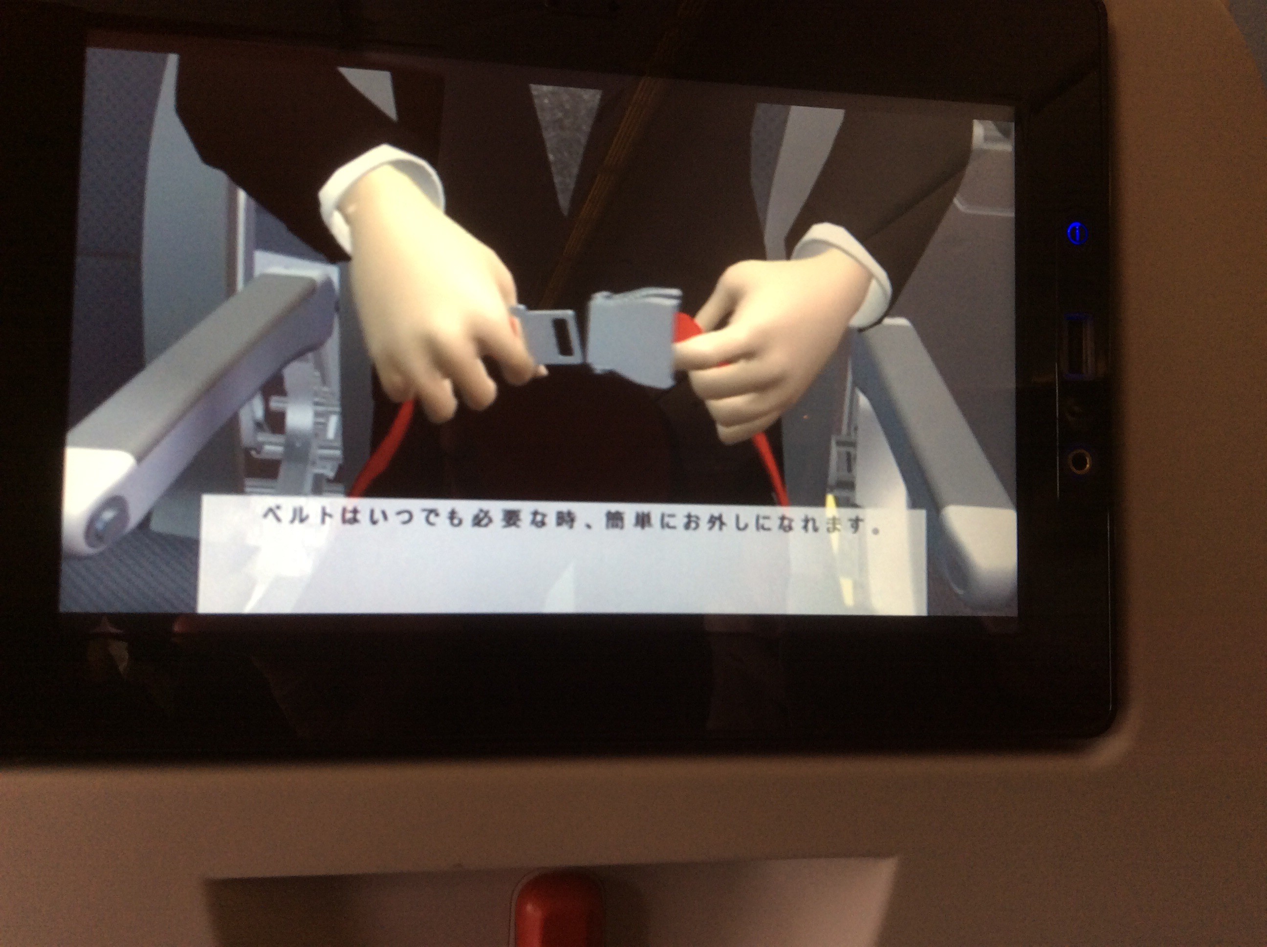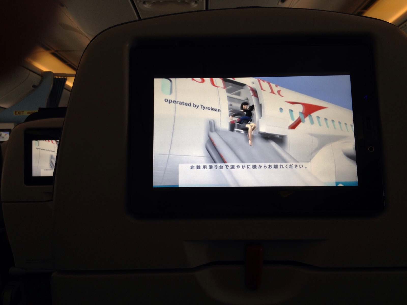 飛行機出発前のアナウンスでは、避難訓練の様子が。公園の滑り台を思い出しました。