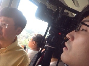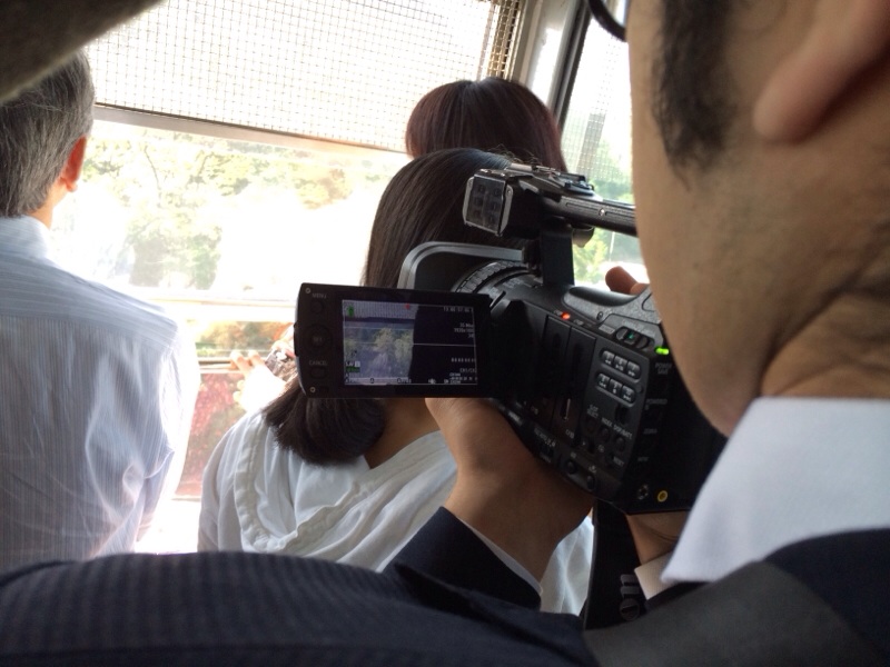 ケーブルカー内から映像を撮っている出西牧師とヨハネくん!