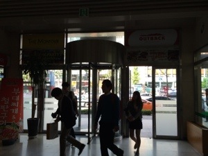 Many people go out and come in.