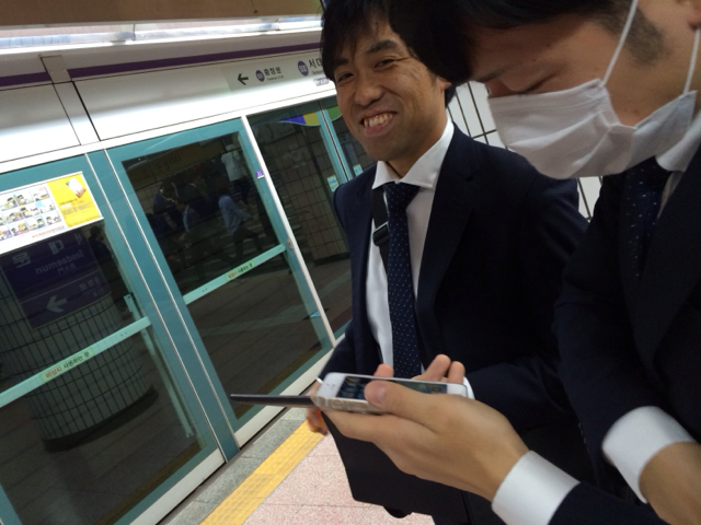 韓国の電車は日本より少し幅広い感じです。 行き先を示すモニターは日本と一緒です。