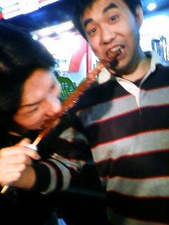 こんな写真が出て来ました。 韓国ソウルの露店で買ったお肉だったと思います。 カブリつくダビデ君とヒサさん!