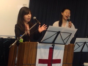 会衆賛美中の萱野牧師、ミッションスタッフの小代さんがOHPをしています。