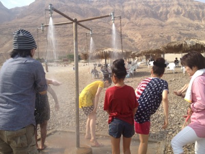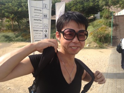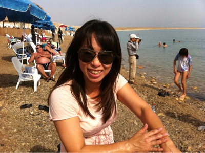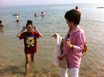 可愛いティーシャツのシオンちゃん。死海にご満悦✌