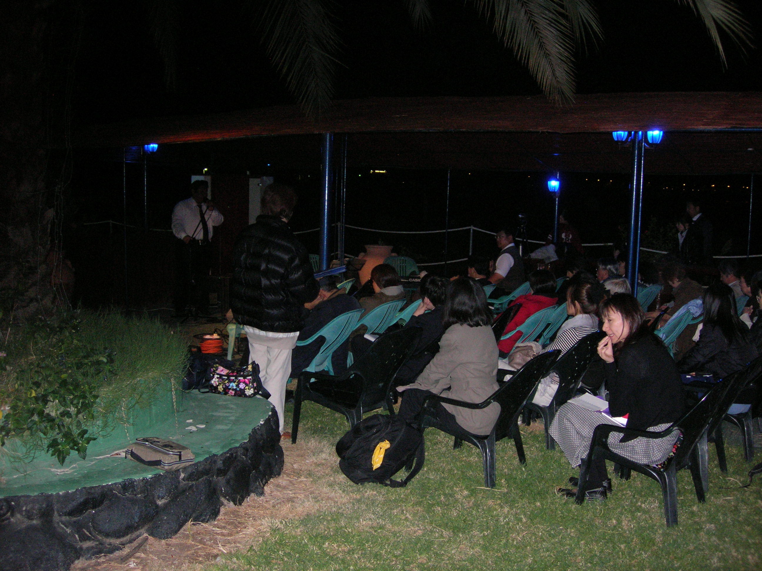 ガリラヤ湖畔の初めて(?)のホテルで、夜の聖会が、野外で行われました。寒い中、まわりを気にすることなく、