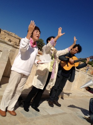 Pastor Sakaki and Ms. Onojima, who are members of La Spouza, praised at the amphitheater in Caesarea. Both of their Christian names are Israel. This year again, they will travel together including the Europe team.
