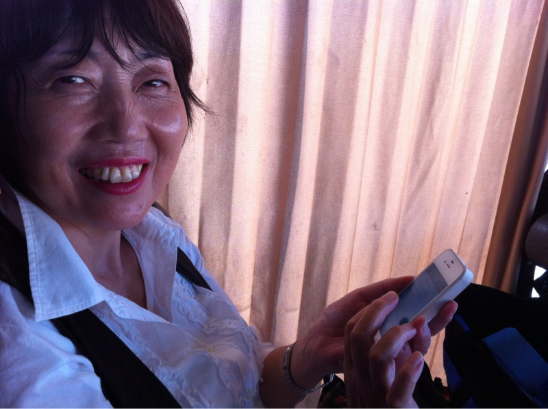 バスの中で、次のヨーロッパチームのコンタクトをしつつも、決して笑顔を忘れない榊牧師( ̄▽ ̄)