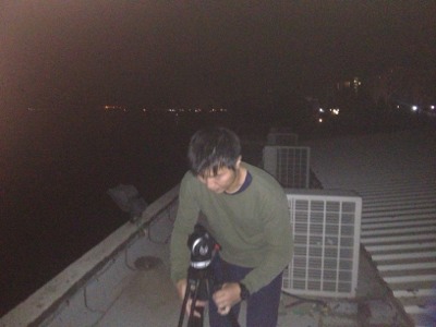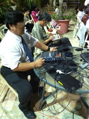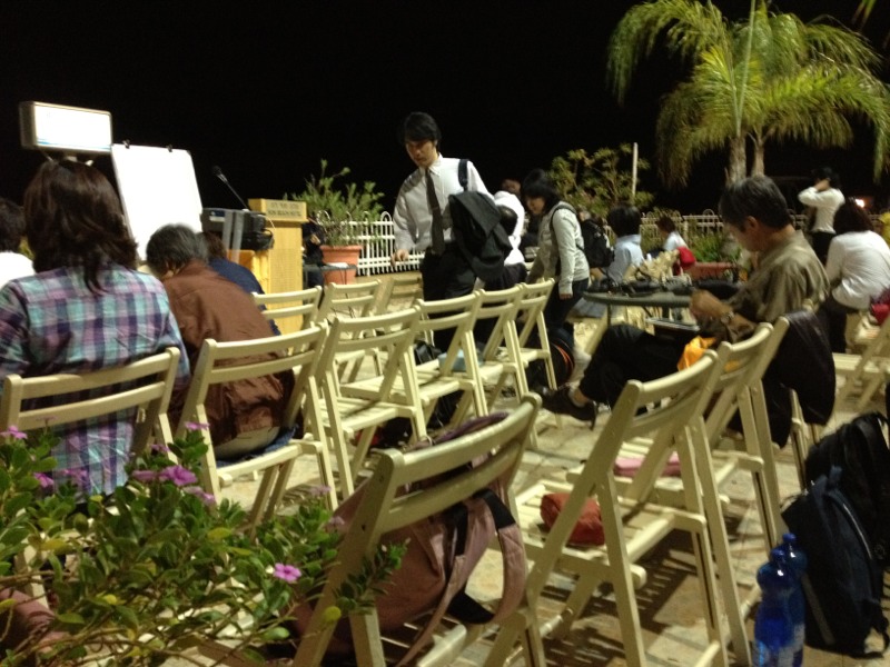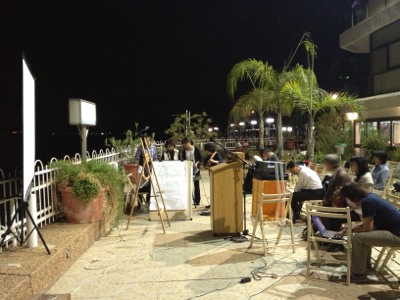 ガリラヤ湖に昇る朝日を撮影するため、ロンビーチホテルの屋上でセッティング中です。