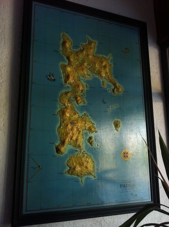 使徒ヨハネは迫害を受けてこの島に流されて、そしてここで主から幻を示されてヨハネの黙示録を書きました。写真はホテルにありました島の立体地図。〜昨年のチームより〜