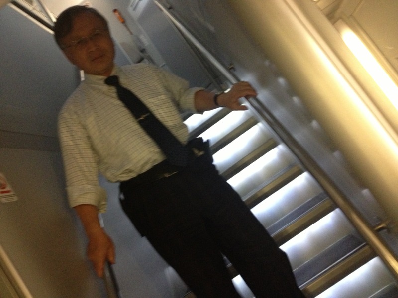 飛行機の中のトイレは、このように、階段を降りて行きます。