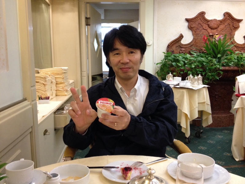 美味しいもの見つけた!このヨーグルトの酸味が美味しくて〜Vサイン。