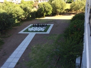 I found a huge chessboard in a garden. It seems like a place for playing game. D