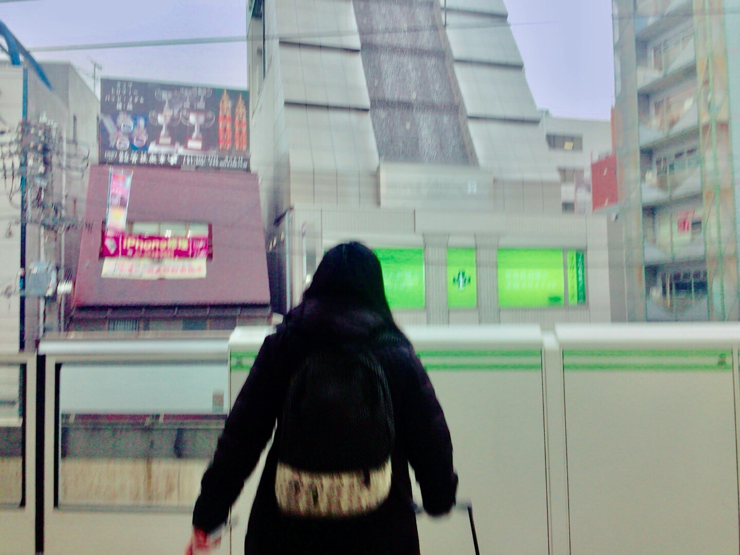 山手線を待ちます! 滝の流れるビルの前!