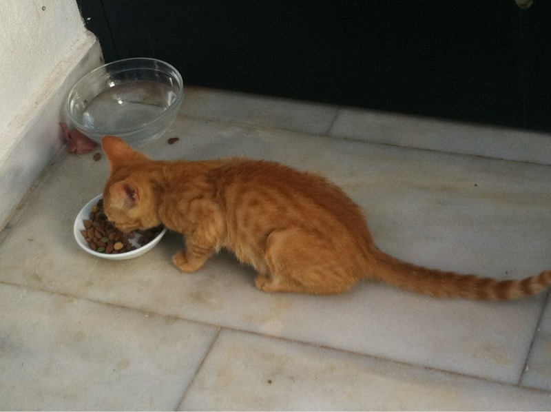 祈りの時、そばでは、カワイイ子猫がエサを食べていました。
