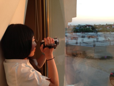 部屋からの眺めを撮影していたら、お隣の部屋から人影が! チームの栄子さんでした(o^^o)