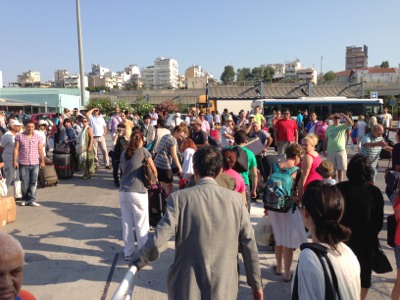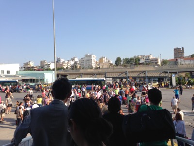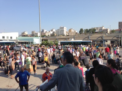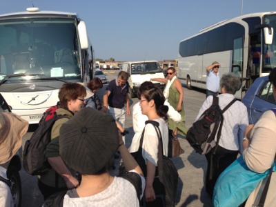 ピレウスでアテネのガイドさんと再会です。ここからバスに乗ります! 「はーい。あっちのバスに乗ってね!」っとパウロ牧師がガイドをしてくださっています♪