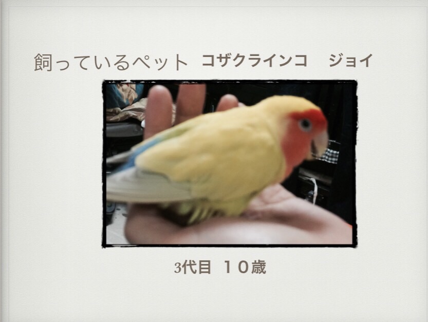先日、自己紹介プレゼンをして、ペットも紹介しました。我が家ではインコを飼って20数年、この子は3代目です。 テモテ