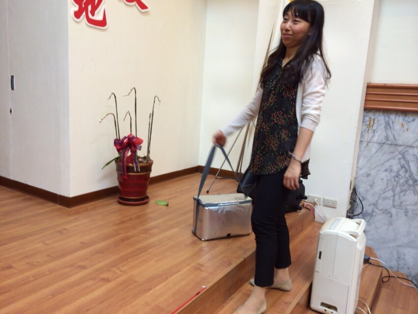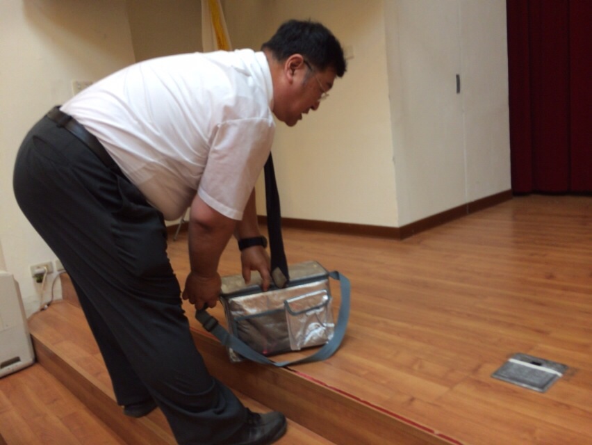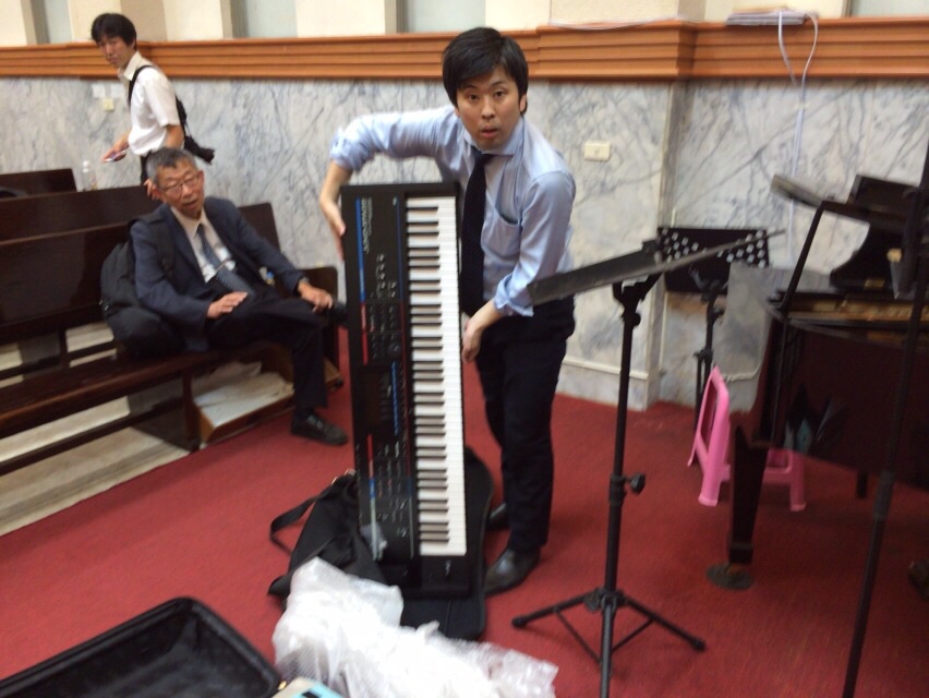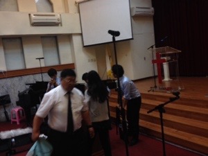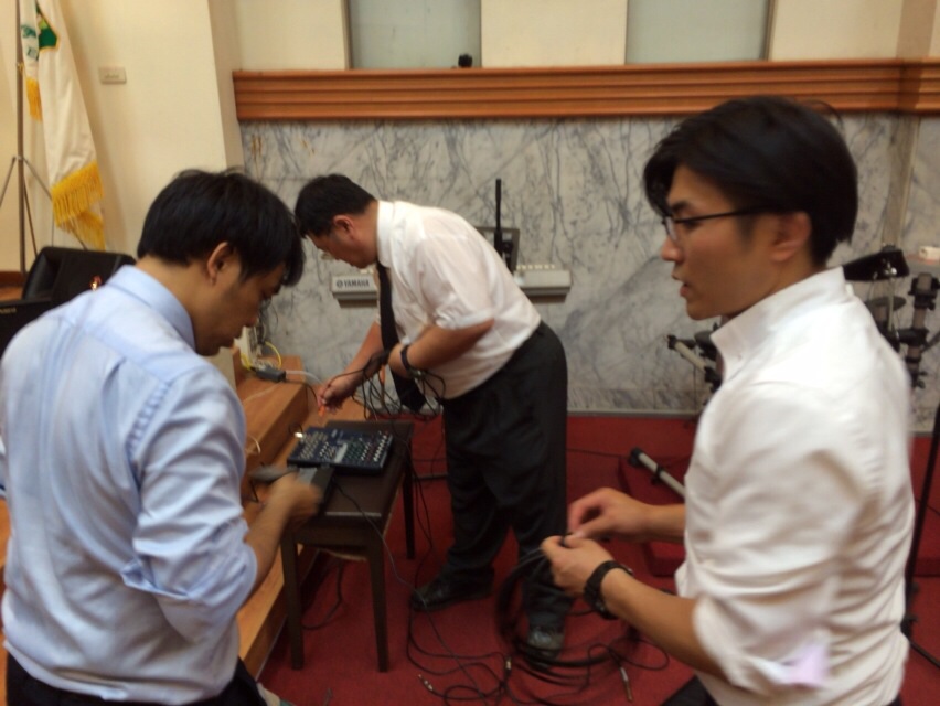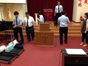 夕食の前に、帰ってから会堂で機材の設営中です。