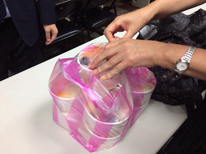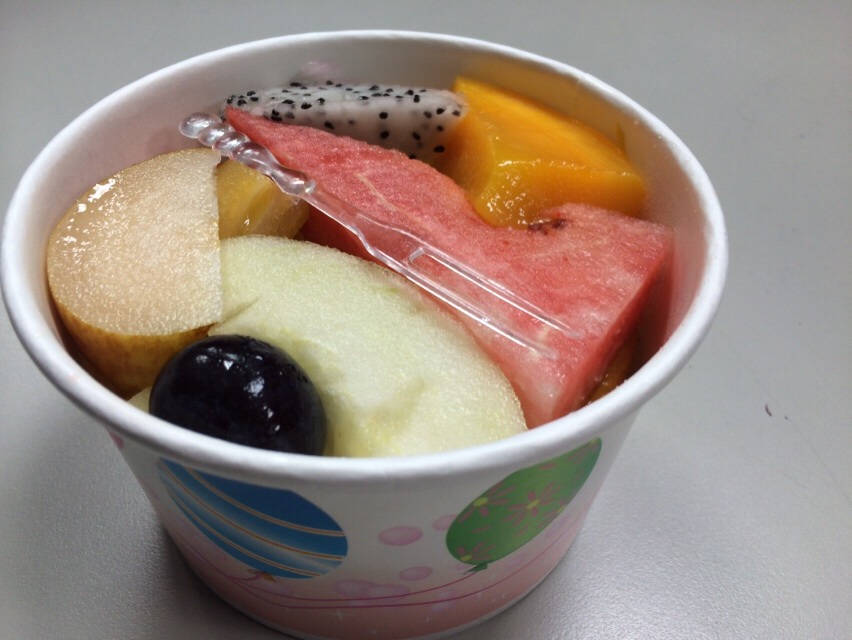 さかきさん、まずはドラゴンフルーツから。 ほかにスイカ、梨、ぶどう、フルーツトマト、グァバ、スターフルーツ、?、?、?、?が入ってました!