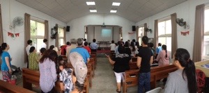 祈りが熱心です。全員が声を出してそれぞれ祈ります。ところでこの山里の小さな教会にも、ワイヤレスマイク、液晶ビジョンによる歌詞提示など最新の機材が用いられています。