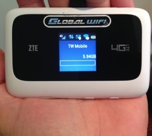 先に、電池切れ対策に、持ち歩きの充電池の紹介をしましたが、もう一つ。これは手のひらに乗る移動専用のWi-Hiルーター(インターネット接続をどこでも実現するもの)です。海外では海外専用のものにします。