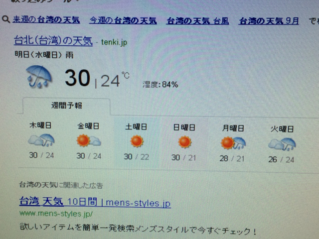 台湾の天気は、チームが行った最初の日は曇り後雨。しかし他の日は晴れの様です。 しかし最高気温は30度、やはり日本より暑いですね。 Kayano