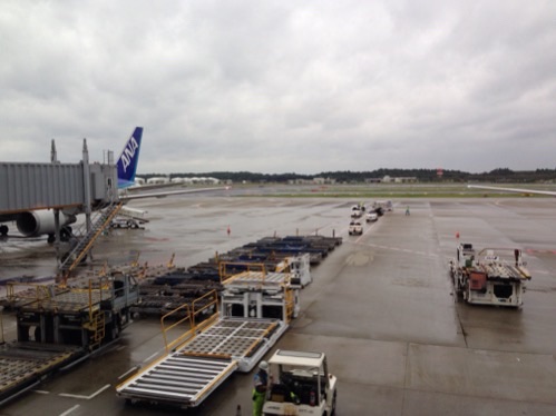 ラウンジに入れることは、束の間の幸せって感じです。少し間に合わせ的なつまむもの、飲み物があって、出発までの時間を静かにくつろぐところです。景色も、今日は曇りですが、こんな感じで良いです。 エバー組