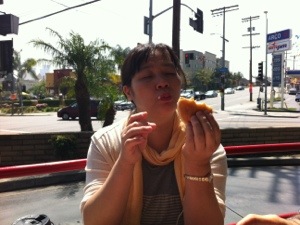 午後に備えて、ドルビーシアターの前で練習中のキブツ。 交渉のうまい真境名牧師は、みぎわさんを説得して(笑)練習を始めました。