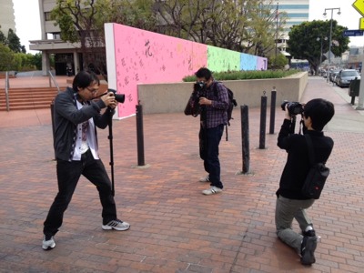 今度はリトルトーキョーの様子を一生懸命三人で撮りあってます(^^)