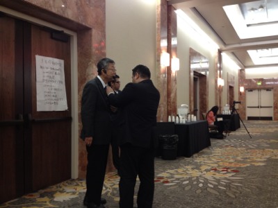 パウロ秋元牧師の賛美、メッセージのためワイヤレスマイクを付けて差し上げる真境名牧師。