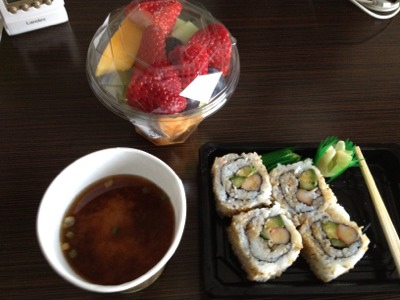 今日の夕食です。 ホテルから歩いて1、2分の日系スーパーマルカイで買ったカリフォルニアロールとフルーツ、日本から持ってきたしじみのお味噌汁です。美味しかったです!