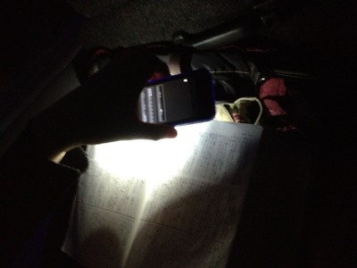 バスの中で読書灯が使えずiPhoneのライトアプリで。ルカ4章です。 1号車
