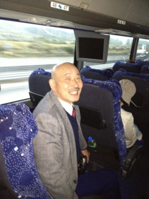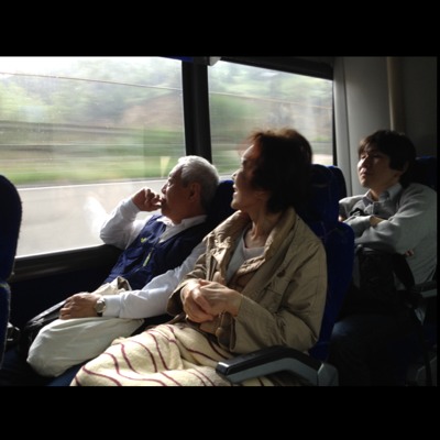 車窓の風景を楽しんでいる伊丹教会の前田牧師ご夫妻。仲むつまじいです。