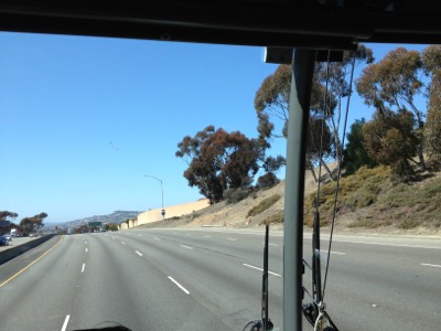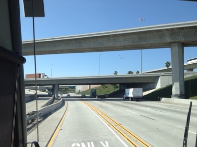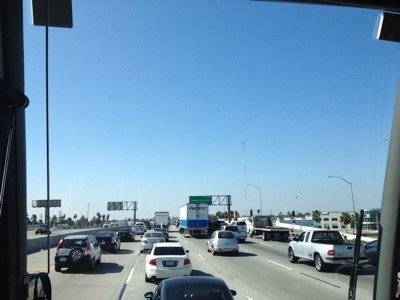 ダウンタウンの高層ビル群が見えてきました!混まなければ後20分ほど、とのこと。