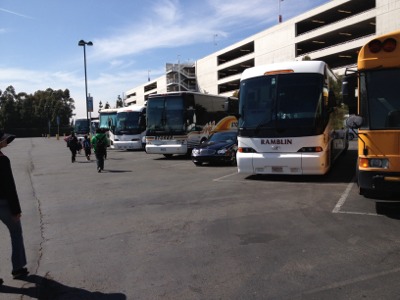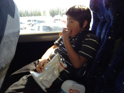バスはゆったり席空いていますが、三人は仲良く詰めて座っています。DL