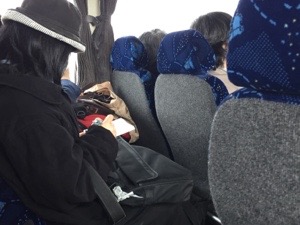 秋元さんは帰りのバスの中でブログを見ておられます。感謝と賛美とリバイバルキャンプ国内組ブログも見ておられます!
