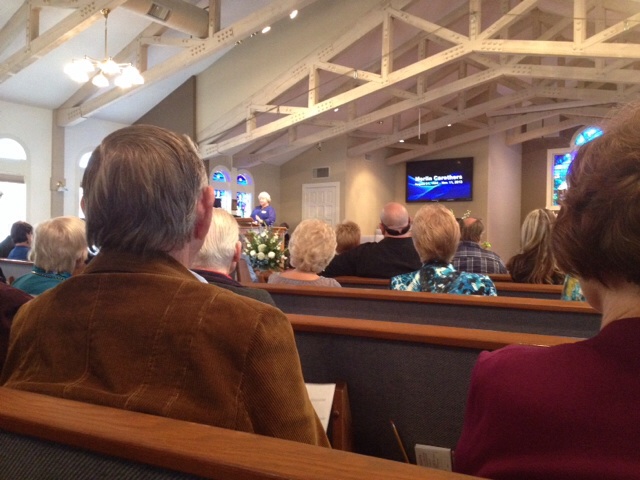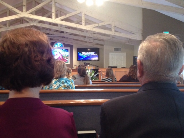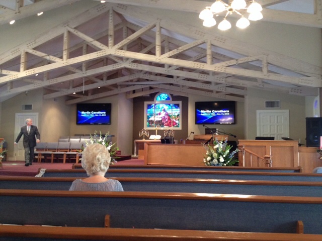 教会内は、このようになっています。スクリーンには、マーリンさんのお名前が書かれています。  (L.A);