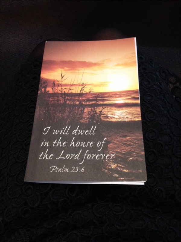 メモリアルサービスのプログラムです。詩篇23:6が、表には書かれています。 (L.A)