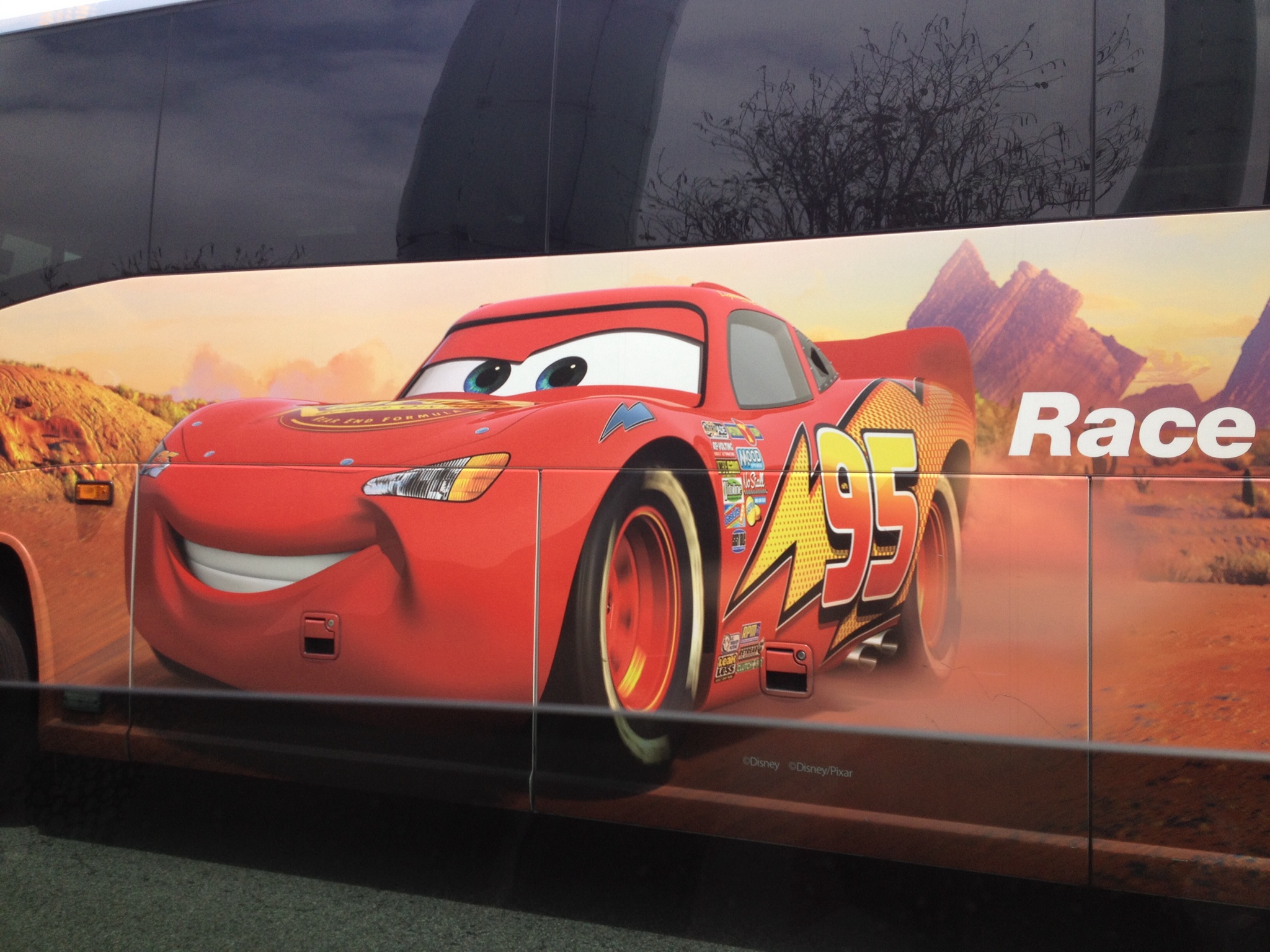 6月10日! ディズニーランドのバスに遭遇^ ^ カーズのマックィーン? もうすぐ駐車場です。 ロサンゼルス教会
