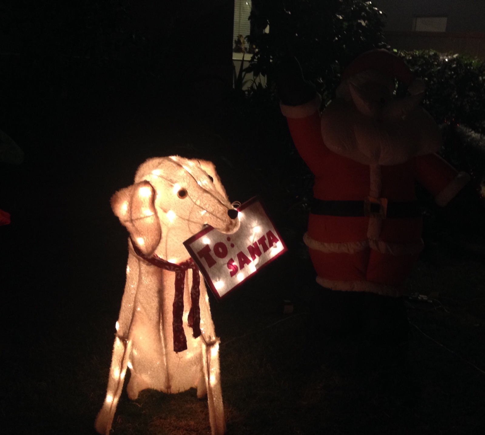 5:30pm 外は、すでに真っ暗。。 我がアパートの前の飾り付けですが、ワンちゃんがサンタさんにプレゼントのリクエストの手紙を咥えているようです!(^.^) ロサンゼルス F