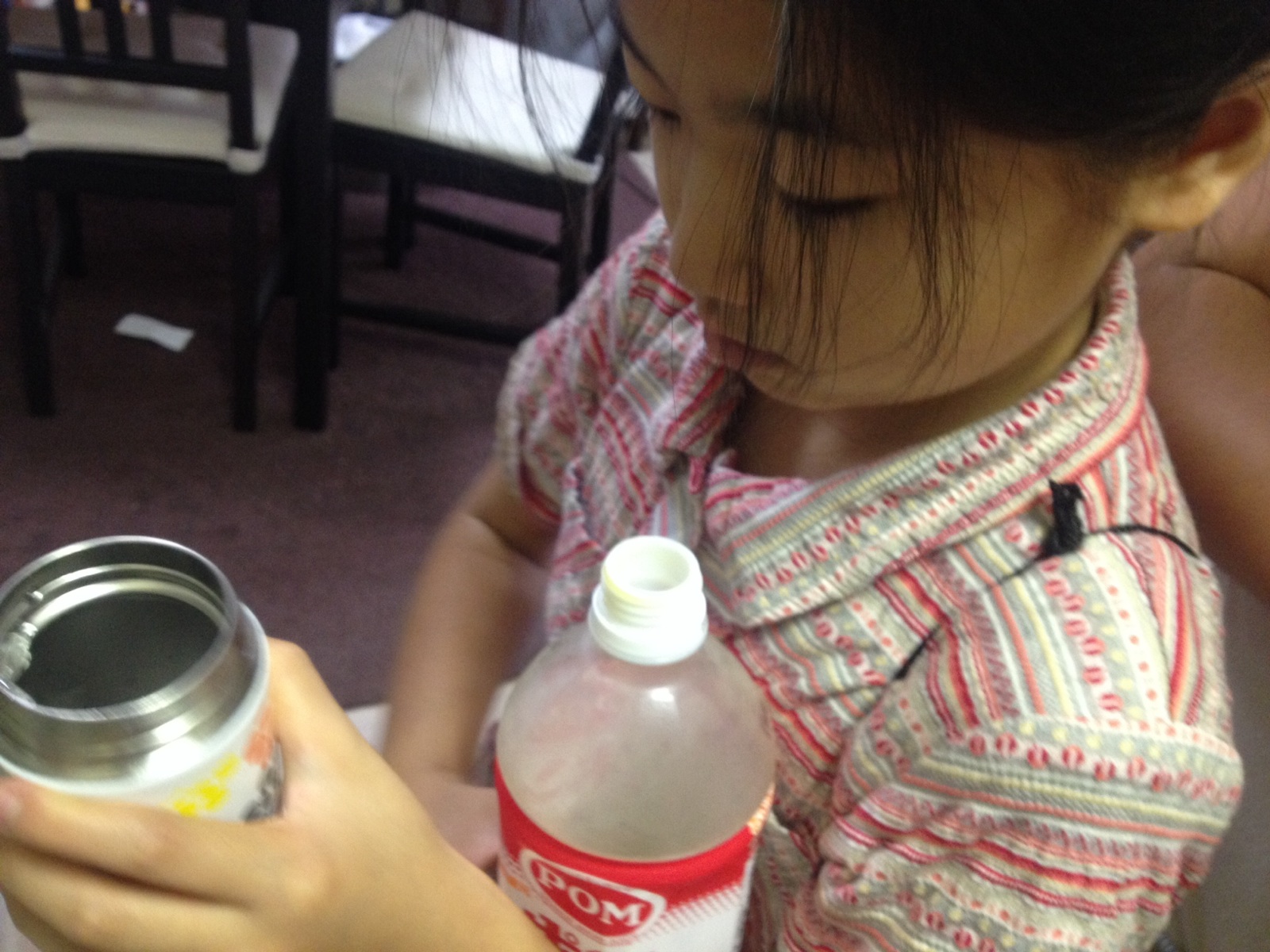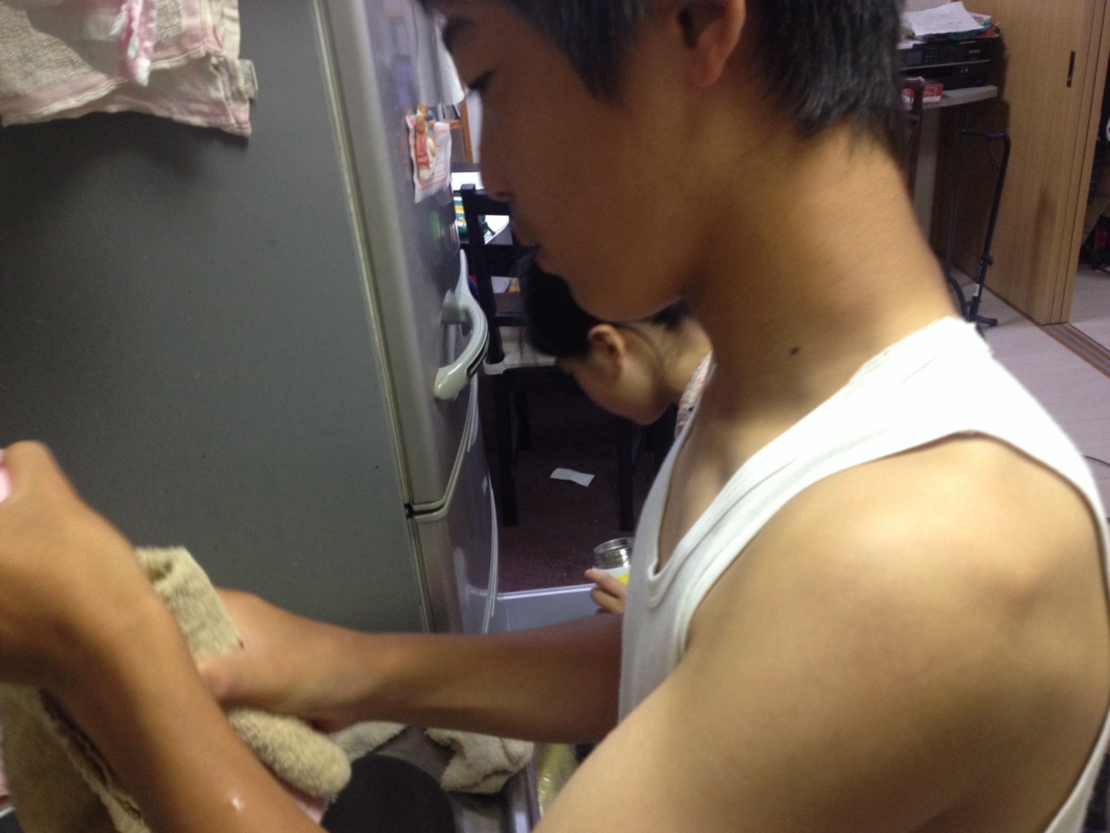 礼拝に行く前に水筒とか準備してます。ゼリーを何個食べたのかポンジュースは何でこんなに減ってるのか…などでもめてました、笑