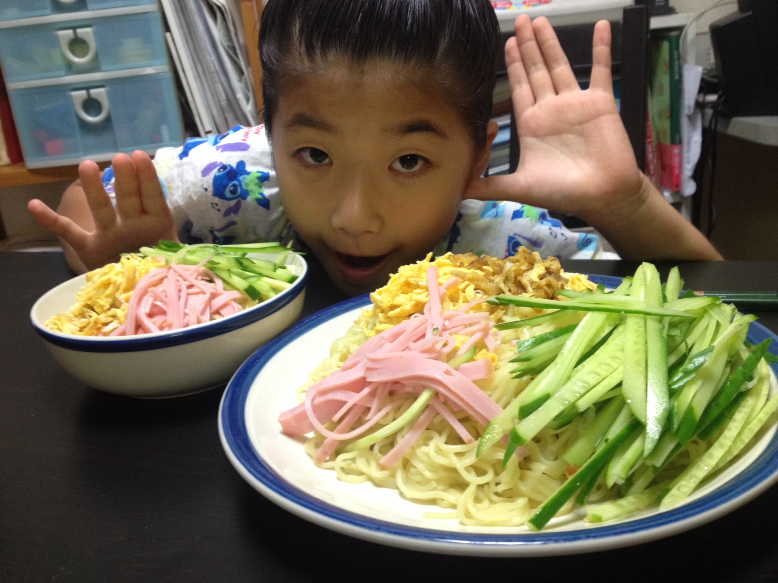 夕飯は冷やし中華でした、お兄ちゃんの量と妹の量が違います。白馬キャンプでは妹もいっぱい食べます。 東フィラデルフィヤ シオン