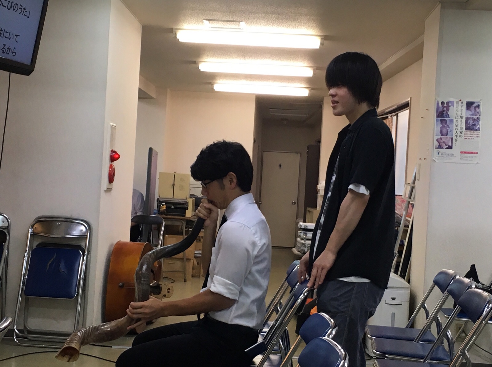 角笛の準備しているGiftsのダビデ君、今日はクロちゃんも来ています! Gifts Kayano