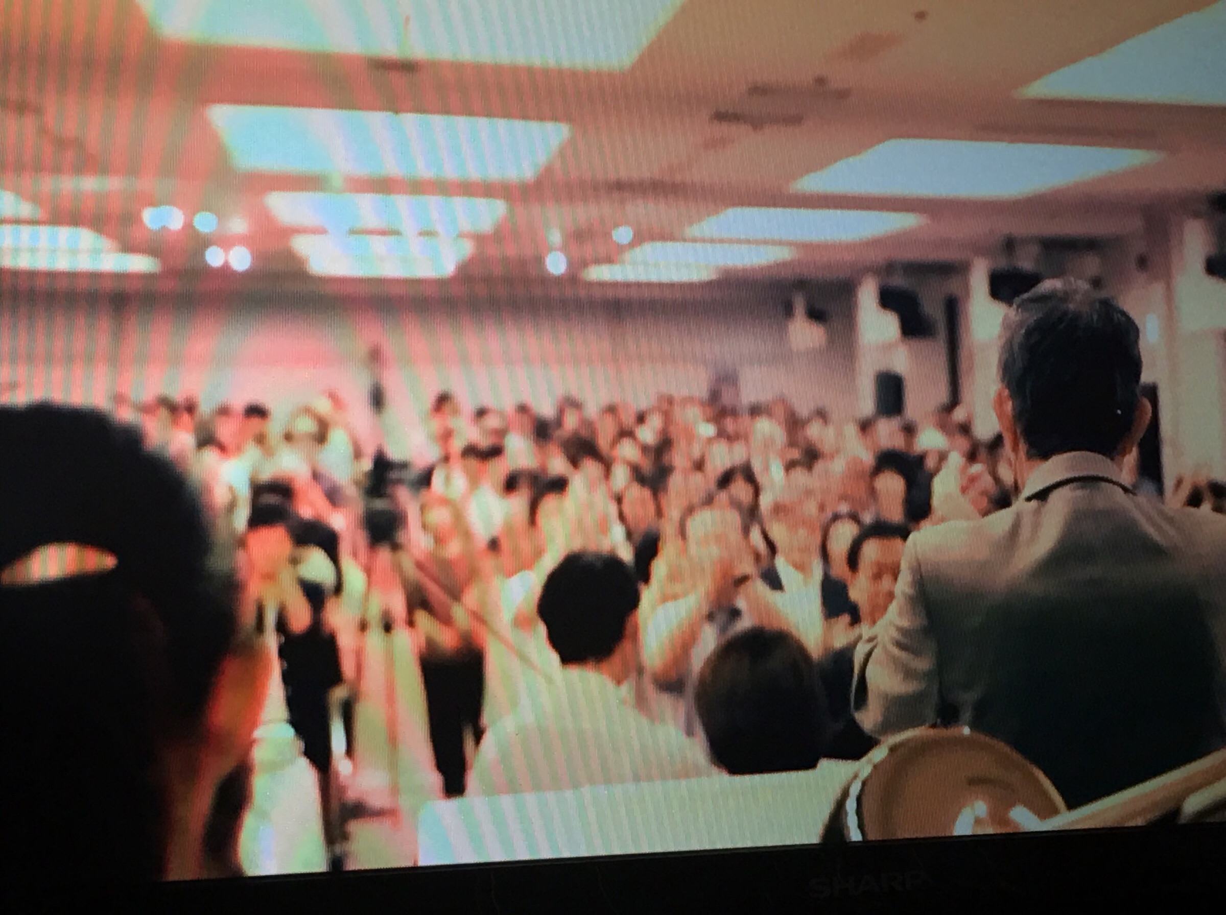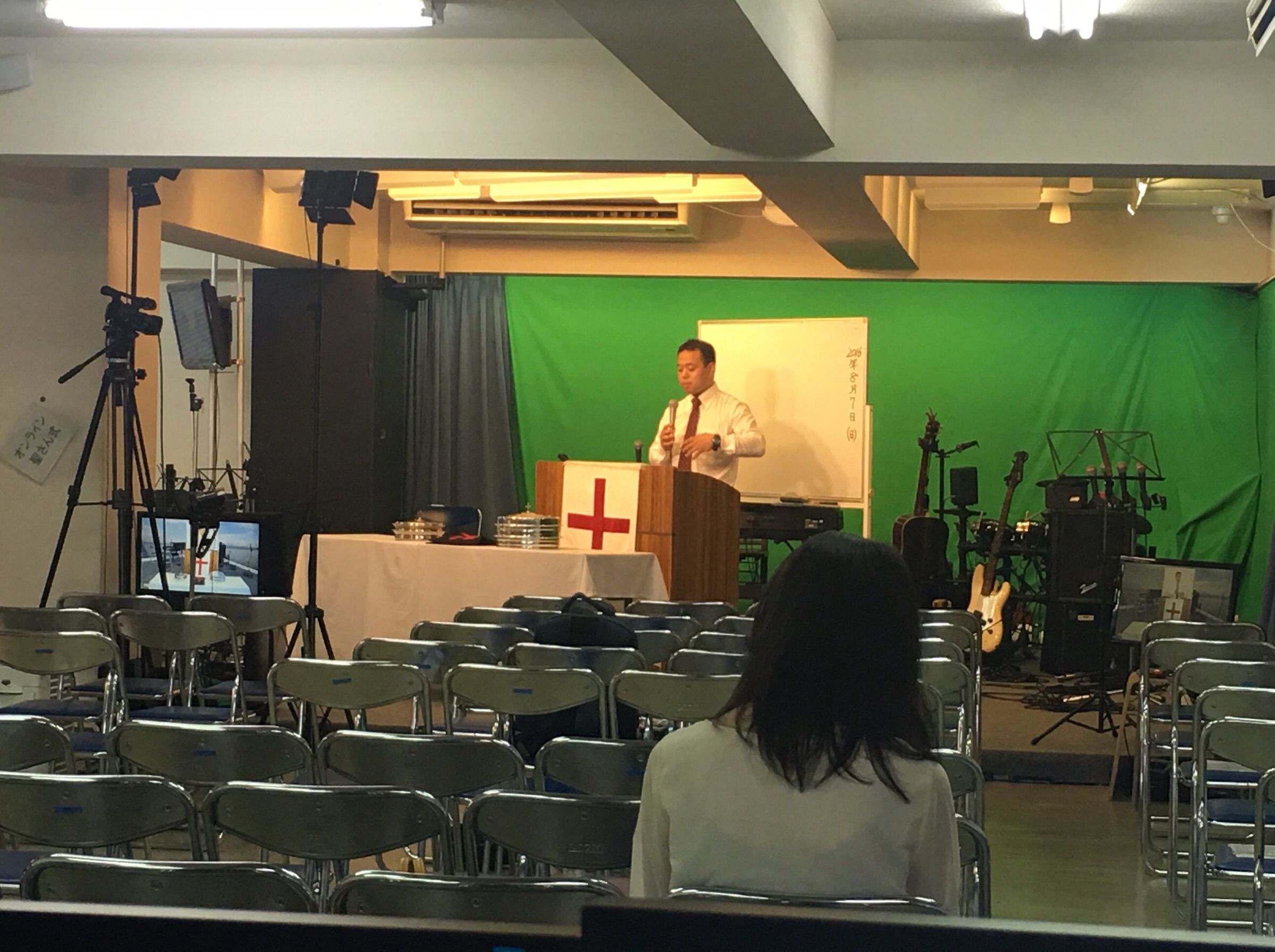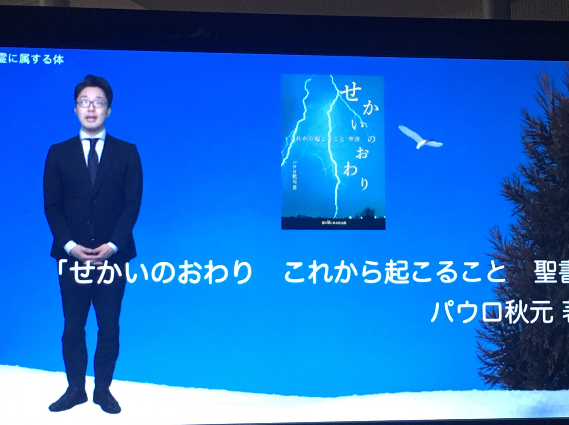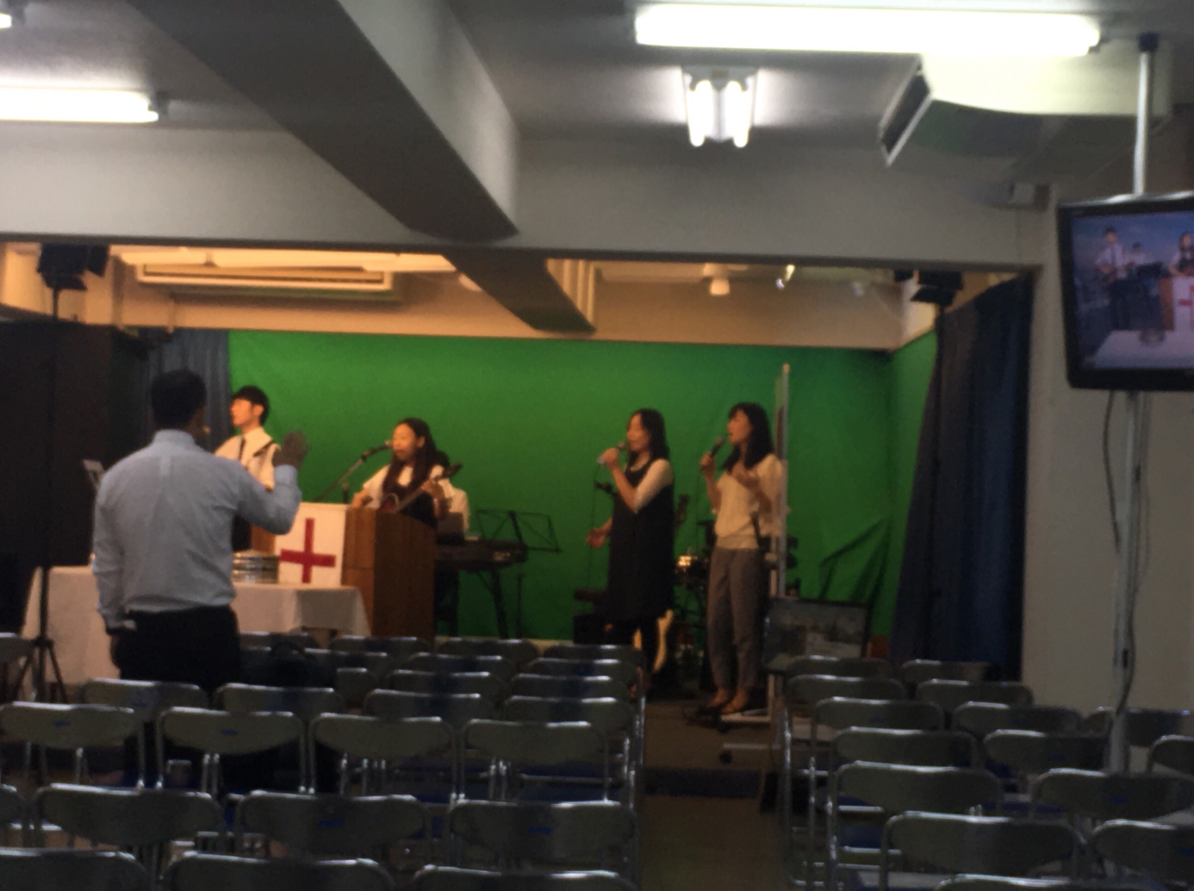 賛美の後、メッセージへ。 1分動画と白馬キャンプのダイジェスト映像を見ています。